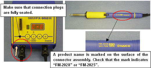 Causes:A soldering iron other than HAKKO FM-2025/2028 is used. Or a connection plug may not be fully seated.