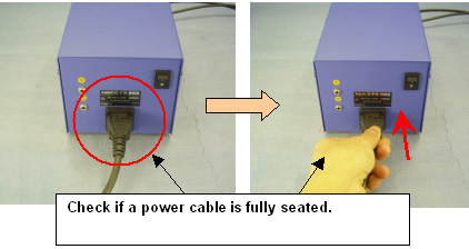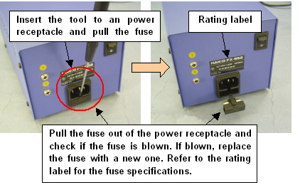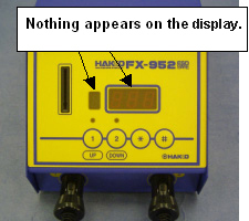 Countermeasures:Check the connection of the power cable and condition of the fuse in the power receptacle. If nothing appears on the display even if there are no problems with the power cable and the fuse have, a printed circuit board or a transformer may be faulty. Contact a HAKKO office, a service center or a distribution outlet near you to have the faulty soldering station, the sleeve assembly, the connector assembly and the soldering tip repaired. Two ways to have a faulty assembly repaired: