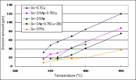 Fig. 1 – Erosion amount depending on solder and tip temperature ( φ1mm×5mm, 2000 times ) *If a tip gets a hole, it should be replaced with a new tip.